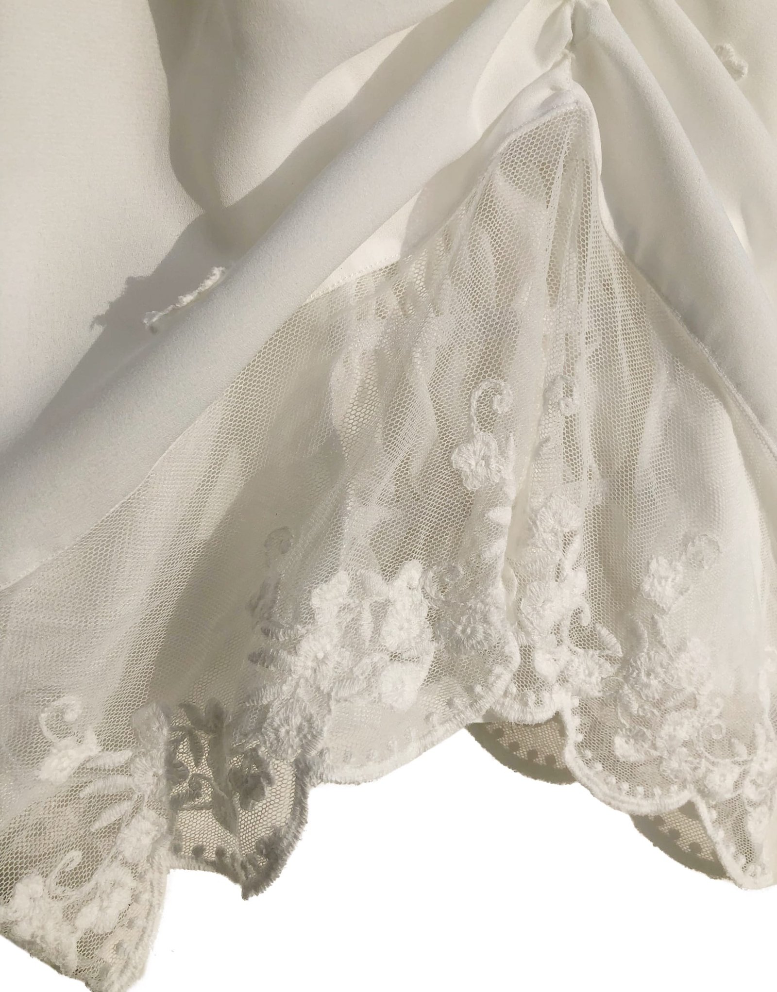 S/ 74.00El precio original era: S/ 74.00.S/ 68.08El precio actual es: S/ 68.08.Blusa de gasa dobbie estilo romántico con encaje bordado en la parte inferior del torso y mangas 🤍