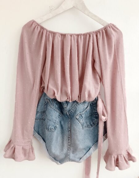 La blusa “Alma resalta por su delicado diseño con bobos en el escote y basta, realzando la feminidad en cada detalle.