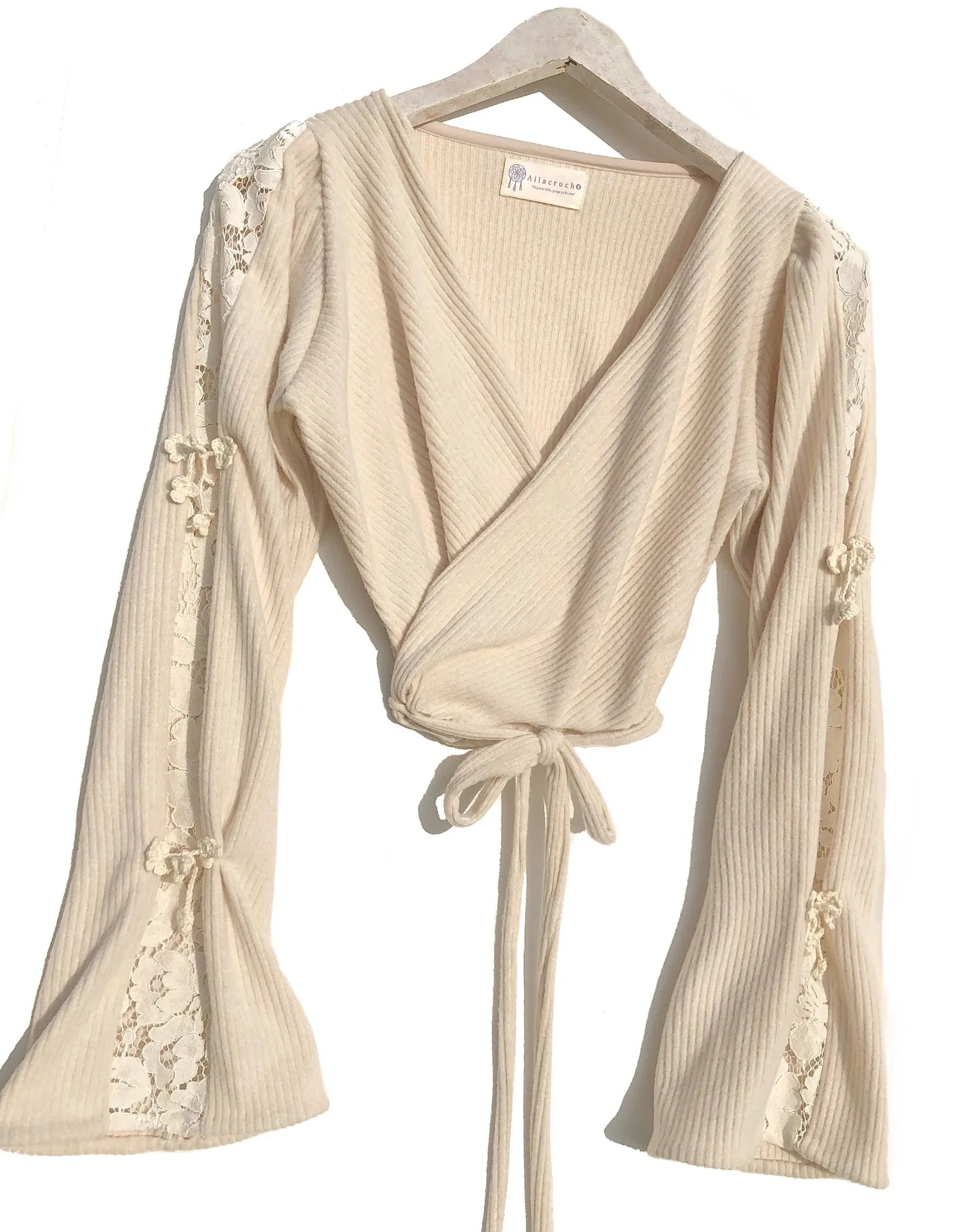 Suéter cruzado de punto canalé color crema , con delicados detalles de encaje floral en mangas acampanadas. Ajuste con lazo en la cintura para resaltar la figura. Femenina, romántica y perfecta para looks casuales o boho chic